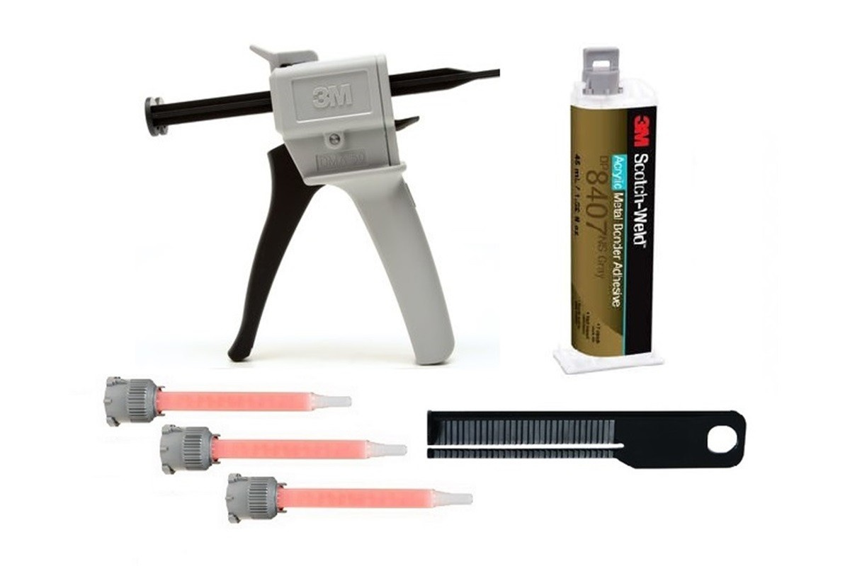 The 3M Structural Bonding Starter Kit for metal bonding includes 3M DP8407 NS adhesive, an applicator, a plunger, and three mixing nozzles at a significantly lower price compared to purchasing the adhesive and application equipment separately. 3M Scotch-Weld DP8407 NS is a high-performance two-component gray acrylic adhesive that offers excellent shear and peel strength and impact resistance. It has excellent adhesion to many plastics and metals. Requires only minimal cleaning or degreasing before bonding. The adhesive provides excellent durability of joints in metals (including raw steel, copper, brass, bronze, and galvanized steel), even when exposed to high temperatures and humid environments. Processing time: 5-7 minutes. Achieving structural strength: 32 minutes. Technical specifications system: two-component adhesive, 10:1, EPX base: methyl methacrylate temperature resistance: 150 °C UV resistance: very good moisture resistance: very good chemical resistance: very good application: applicator from EPX dual cartridge
