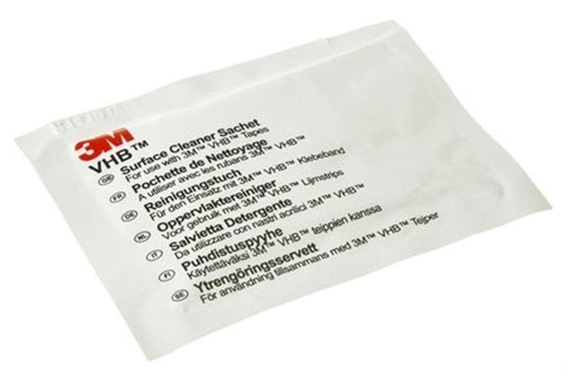 The 3M VHB 1753 cleaning wipe (3M VHB Surface Cleaner Sachet) measuring 145 x 145 mm is impregnated with isopropyl alcohol and demineralized water in a ratio of 90:10. It is ideal for cleaning and degreasing surfaces before bonding with either tape or adhesive. It can be used to clean various surfaces, e.g. metals, plastics, or painted surfaces, but it is always necessary to test the cleaner on the surface beforehand.