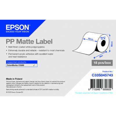 Product description Epson C33S045743 PP Matte, for ColorWorks, 76mm x 29m, polypropylene, white self-adhesive labels