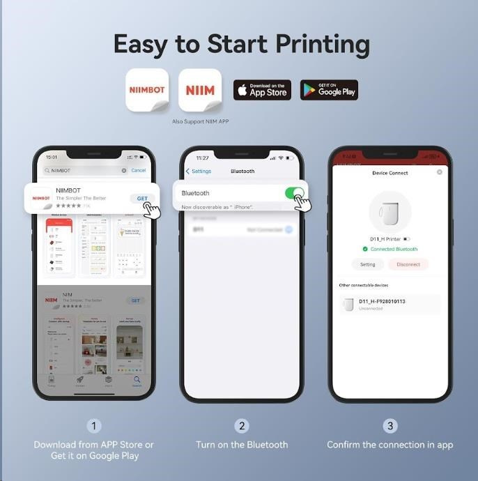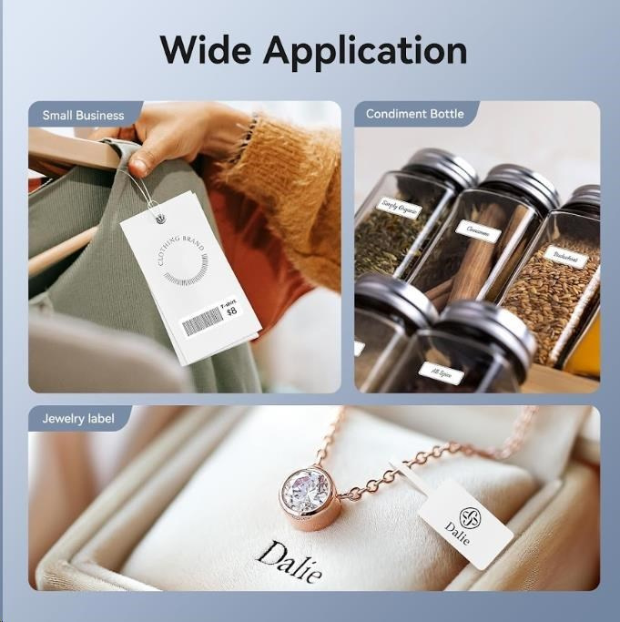 This innovative Bluetooth label maker Niimbot D11-H uses thermal printing without the need for ink or toner, ensuring economical, eco-friendly, and maintenance-free operation. Thanks to the 300 dpi resolution, print width of up to 12 mm, and compatibility with tapes of 12–15 mm width, it creates sharp, readable, and durable labels in professional quality.