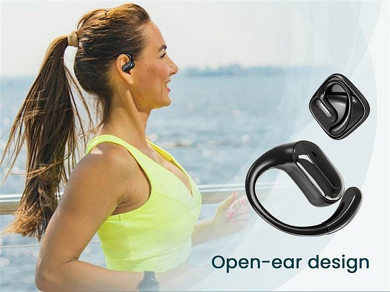 ENJOY WIRELESS MOBILITY The open-ear design keeps you aware, so you stay informed about your surroundings. Listen to music and make phone calls hands-free. Works with a compatible laptop, tablet, or smartphone compatible with BT Features Open BT TWS headphones Open design with a hook for optimal comfort Up to 3 hours of listening on a single charge Battery in the storage case adds up to 9 hours of listening Automatic music muting for incoming calls LED status indicator Specifications Interface: BT v.5 Frequency range BT: 2402 ~ 2480 MHz RF output power: 4 dBm Supported profiles: HSP, HFP, A2DP, and AVRCP Charging time: up to 1 hour Input power: 5.0 V, 300 mA (1.5 W) Operating range: up to 10 m in open space Speaker frequency response: 20 Hz - 20,000 Hz Battery: case 300 mAh; earbuds internal 30 mAh x 2 pcs, Li-Polymer Net weight (whole set): 45 g