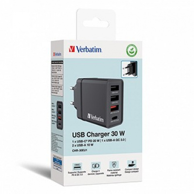 The 30W USB wall charger from Verbatim features a slim design and a sturdy EU plug, combining one 20W USB-C PD port and three USB-A ports (one USB-A QC 3.0 18 W and two USB-A ports 10 W). Ideal for the office, home use, or travel, where it will power up your tablet, smartphone, gaming devices, and many other devices.