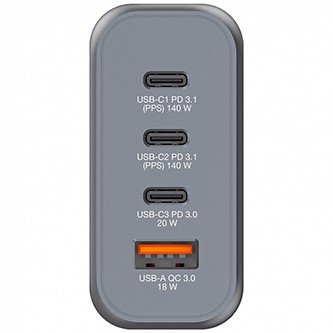 Supports charging up to three devices simultaneously with a maximum total output of 140 W.
