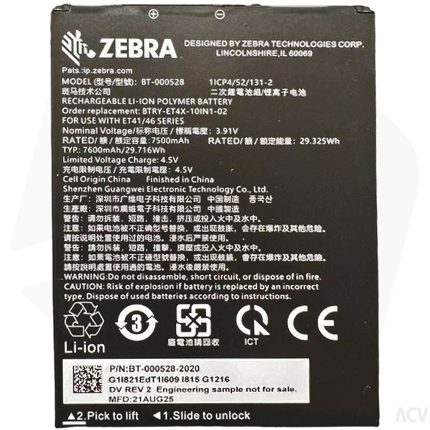 Zebra internal standard battery, 7,600 mAh, fits for: ET401 (10")